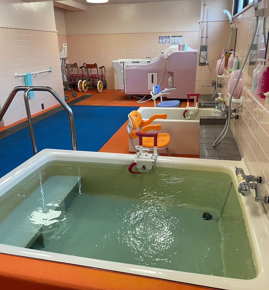 座ったまま入れる機械浴を完備