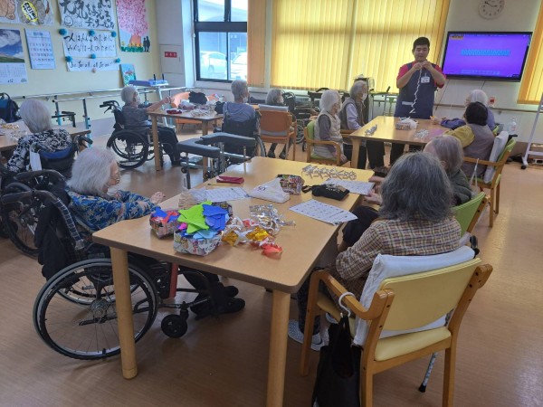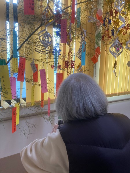 デイサービスで七夕飾りを作り、笹の葉に飾りました。
