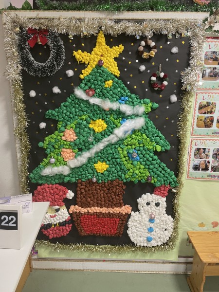 デイサービスセンター海峡つばさ館では、ご利用者様の皆さんでクリスマスアートの壁画を作成しました🎶