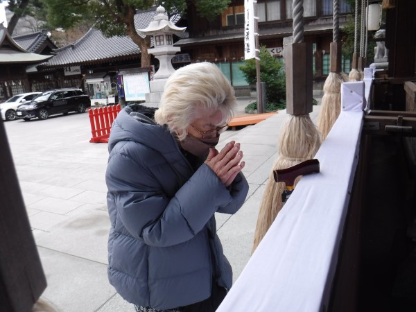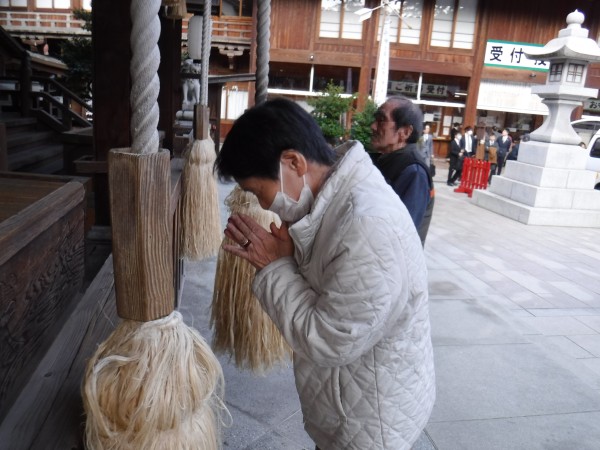 お賽銭を投げた後、本坪鈴(ほんつぼすず)を思い切り鳴らして、お一人おひとり今年の願い事をじっくりとお祈りされていました